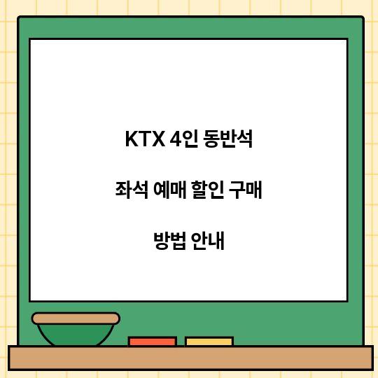 이번 글에서는 KTX 4인 동반석 좌석을 할인받아 예매하는 방법을 소개합니다. 여행을 떠나기 전 필수 정보를 살펴보세요! KTX 4인 동반석 좌석 ...