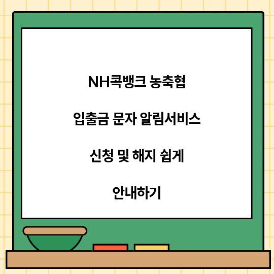 농축협 입출금 문자 알림서비스를 신청하고 해지하는 방법을 알아보는 것은 여러분의 금융 관리에 큰 도움이 됩니다. 이 과정을 쉽게 이해할 수 ...