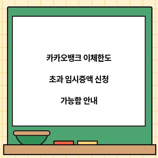 카카오뱅크의 이체한도 초과 임시증액을 신청해 보다 원활한 자금 거래를 도와드립니다. 이 안내를 통해 간단하고 명확한 절차를 확인해 보세요! 카카오뱅크 이체한도 ...